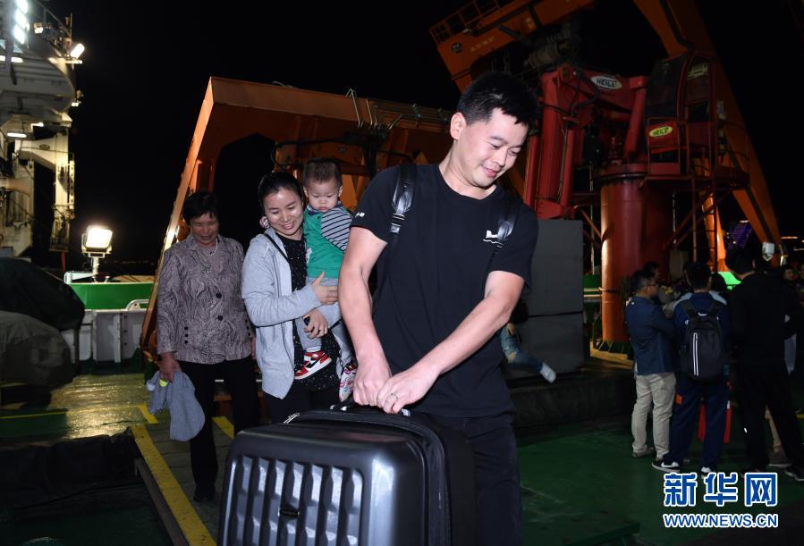 12月21日,“奮斗者”號(hào)海試保障母船“探索二號(hào)”靠泊三亞,科考隊(duì)員和前來(lái)迎接的家屬一起離船。新華社記者 趙穎全 攝