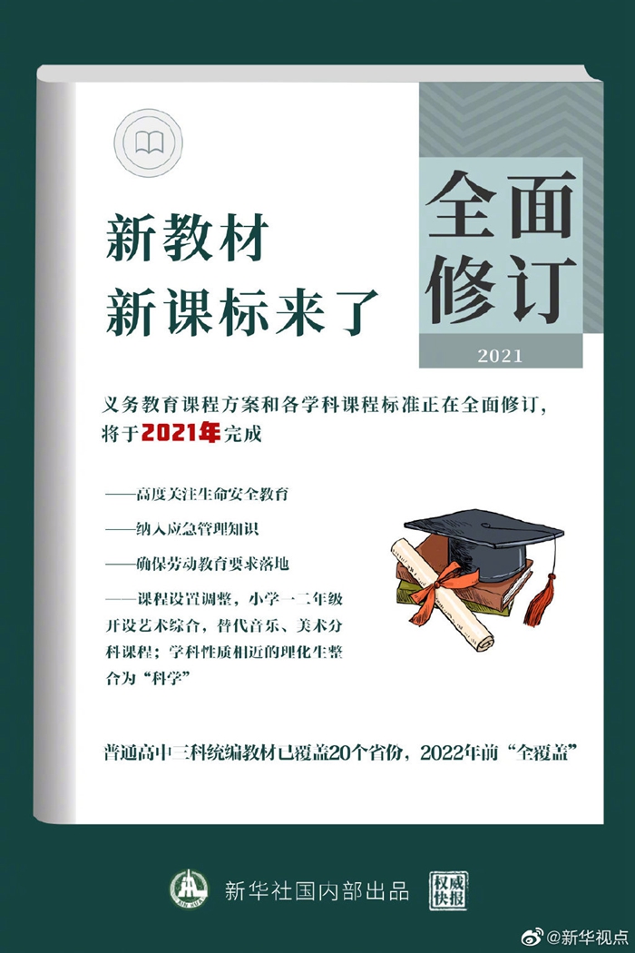 中小學校開什么課?學什么?怎么學?12月24日,教育部召開新聞發布會介紹,義務教育課程方案和各學科課程標準正在全面修訂,將于2021年完成。此外,普通高中道德與法治(思想政治)、語文、歷史三科統編教材已覆蓋20個省份,2022年前將實現所有省份“全覆蓋”,到2025年實現所有年級“全覆蓋”。(記者胡浩 海報設計張晨光)