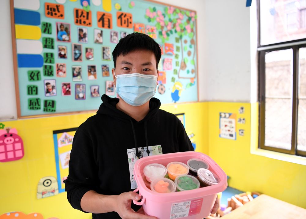 ??12月18日,孫浩在合肥鋼鐵集團第一幼兒園展示手工課用品。