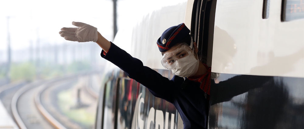 在武漢站,G431次列車乘務員艾婷婷在發車前向乘客揮手(4月8日攝)。