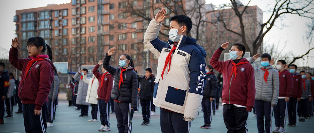 在北京四中廣外校區,蔡昊霖(前)和同學一起參加升旗儀式(12月21日攝)。