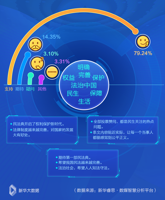 新華睿思數(shù)據(jù)顯示,近八成網(wǎng)民對(duì)民法典草案表示支持和肯定,認(rèn)為“民法典開啟了權(quán)利保護(hù)新時(shí)代”“法治中國(guó)給老百姓帶來實(shí)實(shí)在在的好處”。從話題熱詞分析來看,“法治中國(guó)”“完善”“保護(hù)”三大熱詞有效地呼應(yīng)了編纂民法典的出發(fā)點(diǎn)和落腳點(diǎn)。