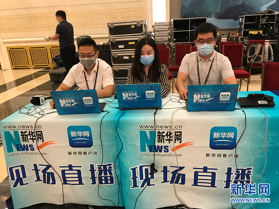 ??? 2020年5月28日下午十三屆全國人大三次會議閉幕后,國務院總理李克強在人民大會堂三樓金色大廳出席記者會并回答中外記者提問。為有效防控疫情,共同維護公共衛生與健康,記者會采用網絡視頻形式進行。圖為新華網現場直播團隊。 新華網 王翰林 攝