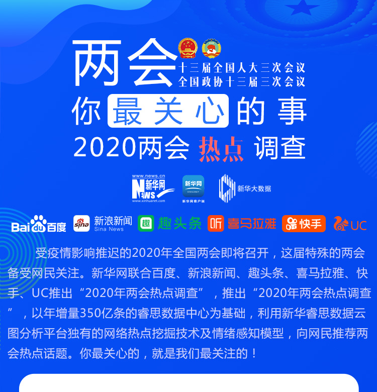受疫情影響推遲的2020年全國兩會即將召開,這屆特殊的兩會備受網民關注。新華網聯合百度、新浪新聞、趣頭條、喜馬拉雅、快手、UC推出“2020年兩會熱點調查”,以年增量350億條的睿思數據中心為基礎,利用新華睿思數據云圖分析平臺獨有的網絡熱點挖掘技術及情緒感知模型,向網民推薦兩會熱點話題。你最關心的,就是我們最關注的!