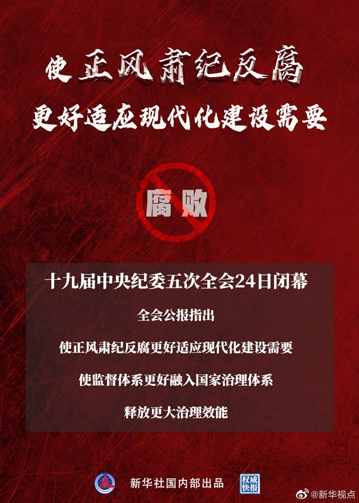 24日,十九屆中央紀(jì)委五次全會(huì)閉幕。全會(huì)公報(bào)指出:使正風(fēng)肅紀(jì)反腐更好適應(yīng)現(xiàn)代化建設(shè)需要,使監(jiān)督體系更好融入國(guó)家治理體系,釋放更大治理效能。(記者:朱基釵、孫少龍;海報(bào)設(shè)計(jì):朱舜) ????