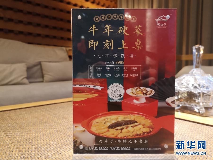 這是2月17日在成都一家中餐廳拍攝的春節期間推出的半成品“牛年硬菜”佛跳墻的廣告牌(手機照片)。新華社記者 胡旭 攝