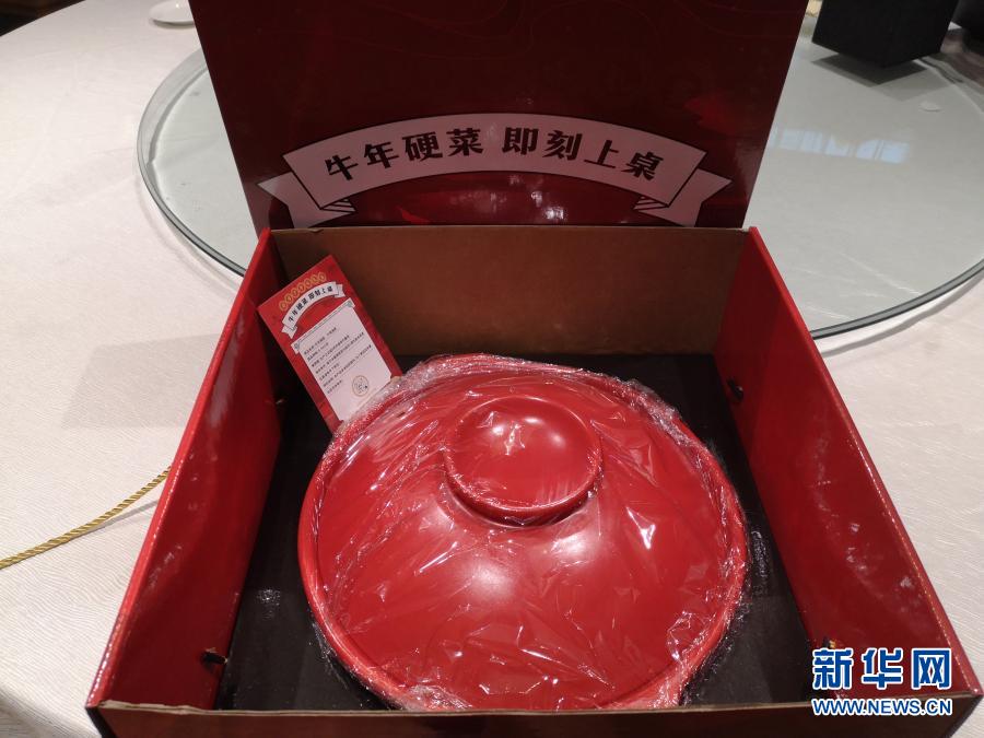 這是2月17日在成都一家中餐廳拍攝的春節期間推出的半成品“牛年硬菜”干燒海參的包裝禮盒(手機照片)。新華社記者 胡旭 攝