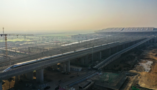 2020年12月27日,從雄安開往北京西的首發列車駛離雄安站(無人機照片)。當日,北京至雄安新區城際鐵路大興機場至雄安新區段開通運營,京雄城際鐵路實現全線貫通,雄安站同步投入使用。新華社記者牟宇攝