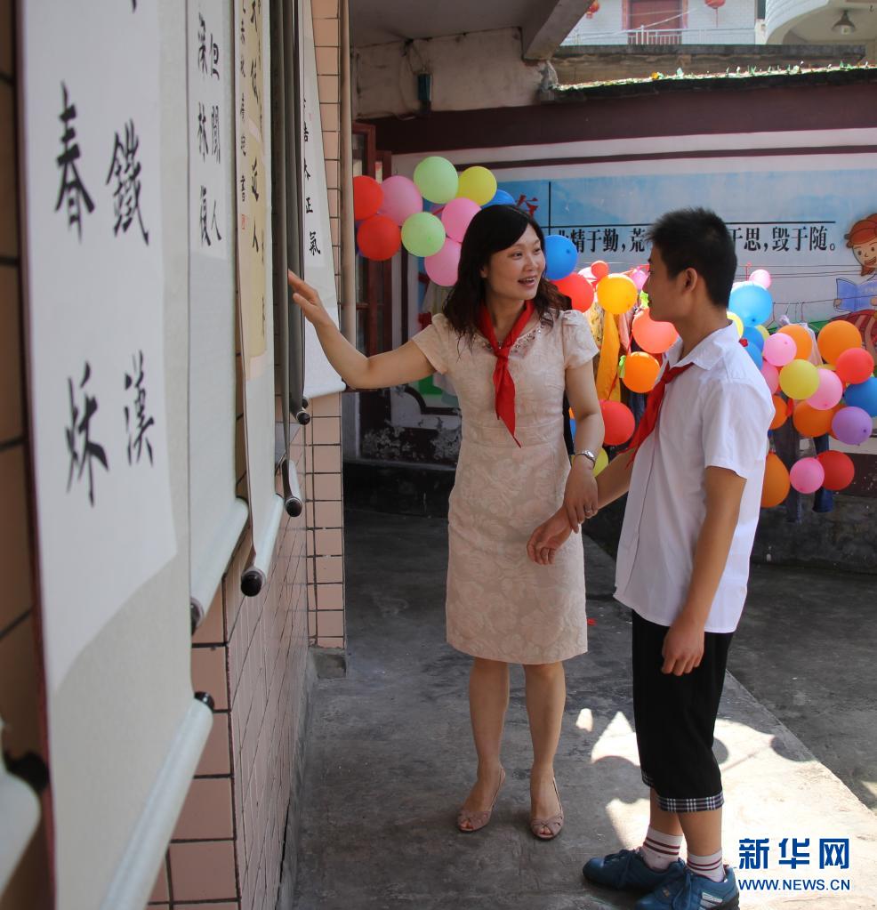 田艷(左)在貴州省印江縣特殊教育學校觀看孩子們的書畫作品(2016年6月1日攝)。新華社發