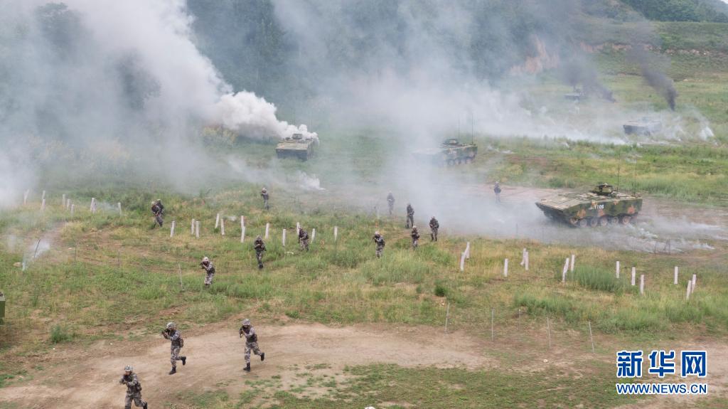 對抗演練中,陸軍第83集團軍某旅“紅一連”官兵突破“敵”陣地前沿(無人機照片,7月4日攝)。新華社發(姜東坡攝)