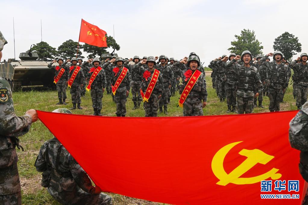 陸軍第83集團軍某旅“紅一連”黨支部為新戰士舉行授槍儀式(7月4日攝)。新華社記者 張永進 攝