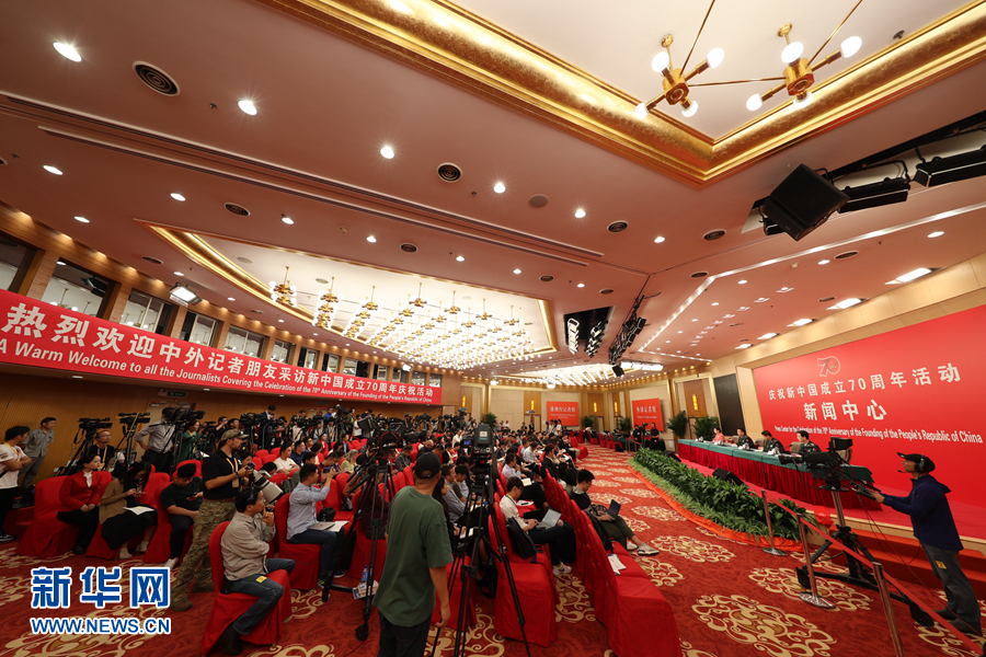 9月24日,慶祝中華人民共和國成立70周年活動新聞中心在北京梅地亞中心二層新聞發布廳舉辦第一場專題集體采訪。圖為新聞發布會現場。新華網記者 郭小天 攝