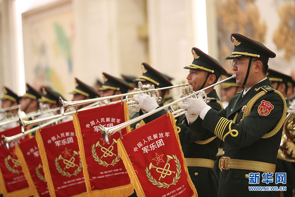 ??? 9月29日上午10時,中華人民共和國國家勛章和國家榮譽稱號頒授儀式在人民大會堂隆重舉行。圖為頒授儀式現(xiàn)場的中國人民解放軍軍樂團。新華網(wǎng) 陳杰 攝
