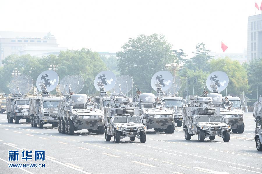 新華社北京10月1日電(記者李國利、李兵峰)身披數碼城市迷彩、高擎通信天線,由16輛國產新型裝備組成的信息作戰第3方隊,1日上午在孫寶泰少將、景賢舫少將的率領下整齊劃一通過天安門。