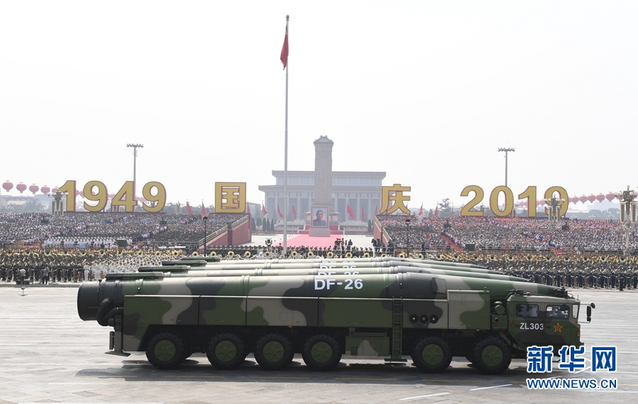 新華社北京10月1日電(記者張選杰、李兵峰)在1日受閱的戰略打擊模塊中,第三個亮相的是東風-26核常兼備導彈方隊。