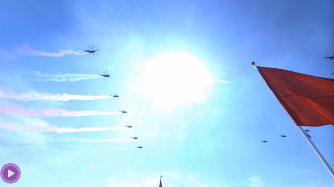 蔚藍的天空中,6架直升機護衛著國旗和軍旗、20架直升機飛成“70”字樣、7架教練機拉出7道彩煙——率先從天安門廣場飛過的空中護旗方隊,揭開了勝利日大閱兵的序幕。9月3日,雄偉的天安門,寬闊的長安街,見證著這場大閱兵的一個又一個精彩瞬間。