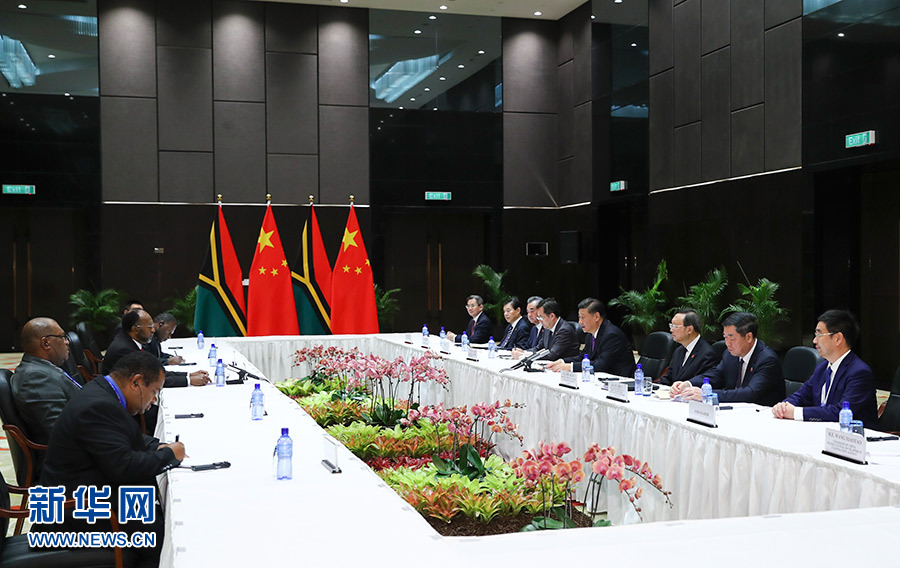 11月16日,國家主席習近平在莫爾茲比港分別會見建交太平洋島國領導人。這是習近平會見瓦努阿圖總理薩爾瓦伊。 新華社記者 謝環馳 攝