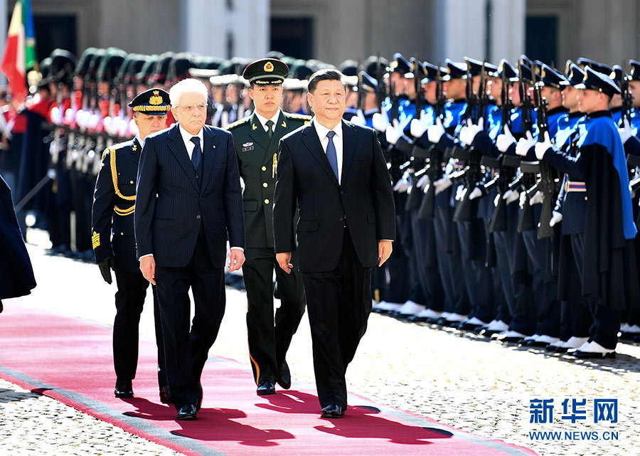 習(xí)近平和夫人彭麗媛抵達時,馬塔雷拉總統(tǒng)和女兒勞拉在停車處迎接,互致問候。隨后,軍樂團奏中國、意大利兩國國歌,升中國國旗。兩國元首一同檢閱儀仗隊。儀仗隊長趨前請習(xí)近平檢閱。習(xí)近平在馬塔雷拉總統(tǒng)陪同下依次檢閱陸軍、海軍、空軍和騎兵方隊。習(xí)近平同意方主要官員握手,馬塔雷拉總統(tǒng)同中方陪同人員握手。