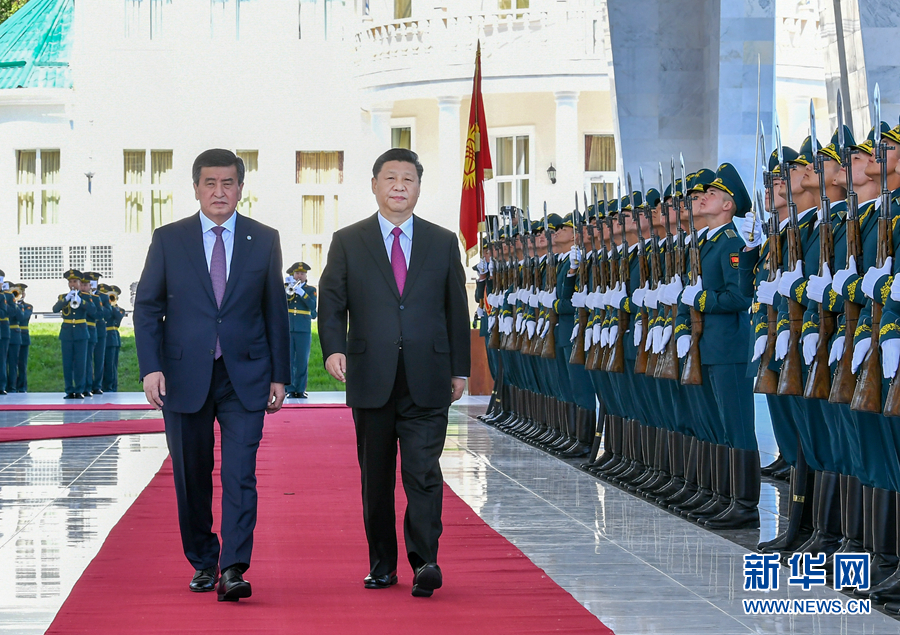 習近平乘車抵達廣場時,受到熱恩別科夫熱情迎接。兩國元首登上檢閱臺。軍樂團奏中吉兩國國歌。兩國元首檢閱儀仗隊。習近平行至儀仗隊中央,用吉爾吉斯語向儀仗隊員問候:戰士們好!儀仗隊員用吉爾吉斯語回答:歡迎您!習近平同熱恩別科夫共同觀看了分列式。