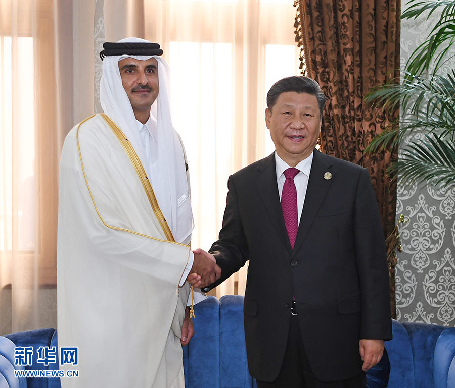 6月15日,國(guó)家主席習(xí)近平在杜尚別會(huì)見(jiàn)卡塔爾埃米爾塔米姆。 新華社記者 王曄 攝