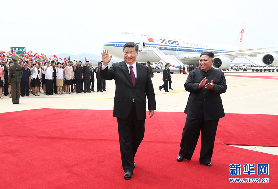 6月20日,中共中央總書記、國家主席習近平乘專機抵達平壤,開始對朝鮮民主主義人民共和國進行國事訪問。朝鮮勞動黨委員長、國務委員會委員長金正恩和夫人李雪主到機場熱情迎接習近平和夫人彭麗媛。朝方在機場舉行隆重歡迎儀式。歡迎儀式結束后,習近平與金正恩同車前往錦繡山太陽宮廣場,沿途數十萬群眾夾道歡迎。 新華社記者 申宏 攝