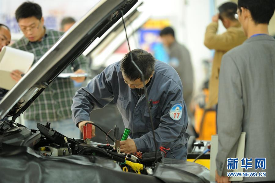 參賽選手在貴陽(yáng)市第二屆技能之星競(jìng)技大賽決賽汽車(chē)維修項(xiàng)目比賽中(2015年11月17日攝)。大賽吸引5000余名來(lái)自貴州省中、高等職業(yè)院校的學(xué)生參加。新華社記者 陶亮 攝