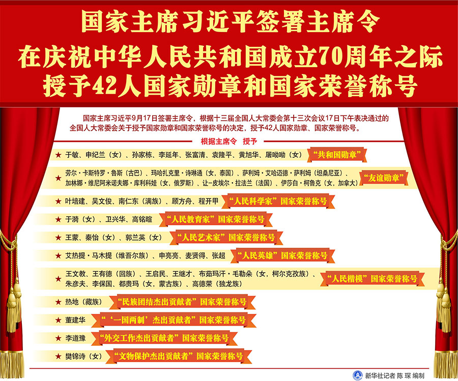 新華社北京9月17日電? 國家主席習近平17日簽署主席令,根據十三屆全國人大常委會第十三次會議17日下午表決通過的全國人大常委會關于授予國家勛章和國家榮譽稱號的決定,授予42人國家勛章、國家榮譽稱號。