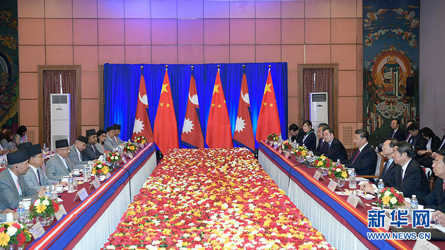 10月13日,國家主席習近平在加德滿都同尼泊爾總理奧利會談。 新華社記者 李學仁 攝