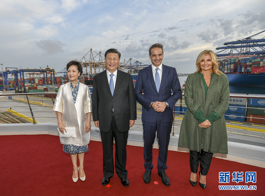 當地時間11月11日,國家主席習近平和夫人彭麗媛在希臘總理米佐塔基斯夫婦陪同下,共同參觀中遠海運比雷埃夫斯港項目。這是習近平和夫人彭麗媛同米佐塔基斯夫婦在港口樓頂平臺合影。 新華社記者 謝環馳 攝