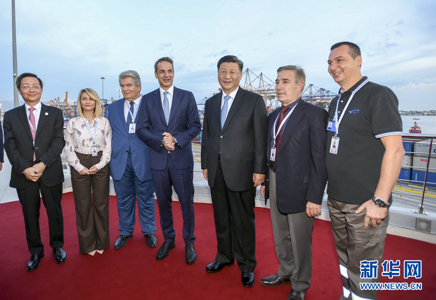 當(dāng)?shù)貢r間11月11日,國家主席習(xí)近平和夫人彭麗媛在希臘總理米佐塔基斯夫婦陪同下,共同參觀中遠(yuǎn)海運(yùn)比雷埃夫斯港項目。這是習(xí)近平和米佐塔基斯同中遠(yuǎn)當(dāng)?shù)貑T工代表等合影。 新華社記者 謝環(huán)馳 攝