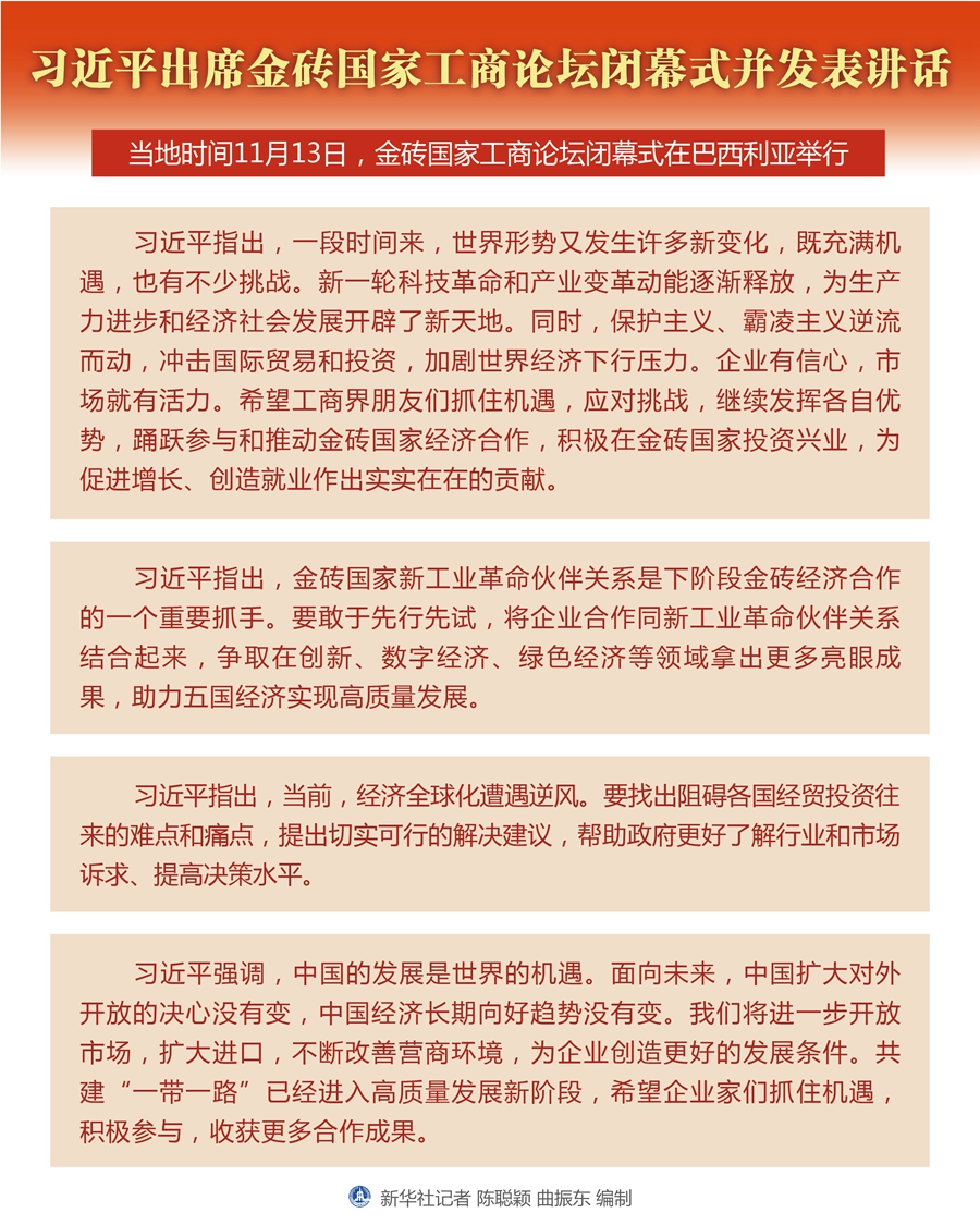 當地時間11月13日,金磚國家工商論壇閉幕式在巴西利亞舉行。國家主席習近平出席并發表講話。 新華社記者 謝環馳 攝