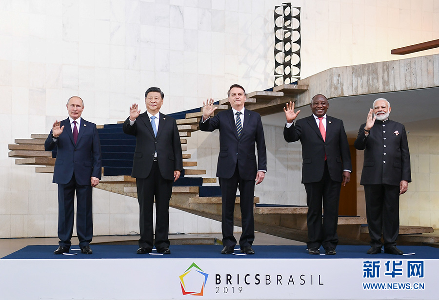 當地時間11月14日,金磚國家領導人第十一次會晤在巴西首都巴西利亞舉行。巴西總統博索納羅主持會晤。中國國家主席習近平、俄羅斯總統普京、印度總理莫迪、南非總統拉馬福薩出席。這是五國領導人合影。 新華社記者 謝環馳 攝