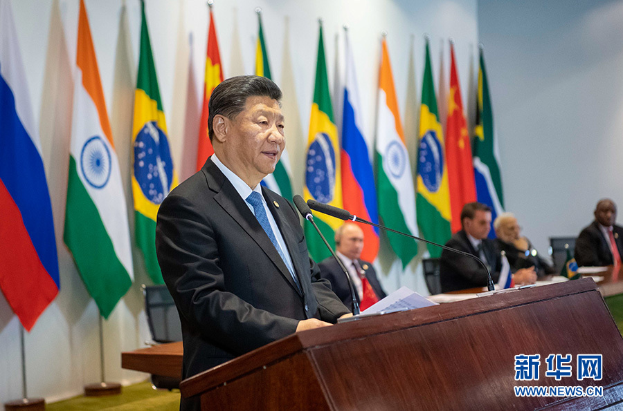 當地時間11月14日,金磚國家領導人同金磚國家工商理事會和新開發銀行對話會在巴西利亞舉行。中國國家主席習近平、巴西總統博索納羅、俄羅斯總統普京、印度總理莫迪、南非總統拉馬福薩共同出席。這是習近平發表講話。 新華社記者 李學仁 攝