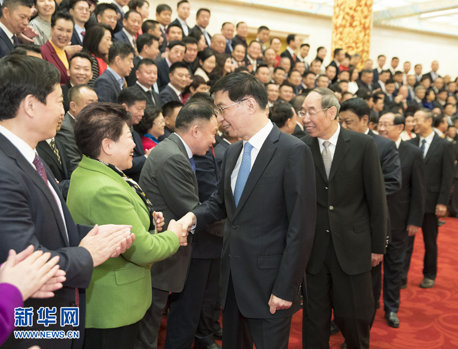 上午9時30分,王滬寧來到人民大會堂金色大廳,同代表們親切握手,并合影留念。