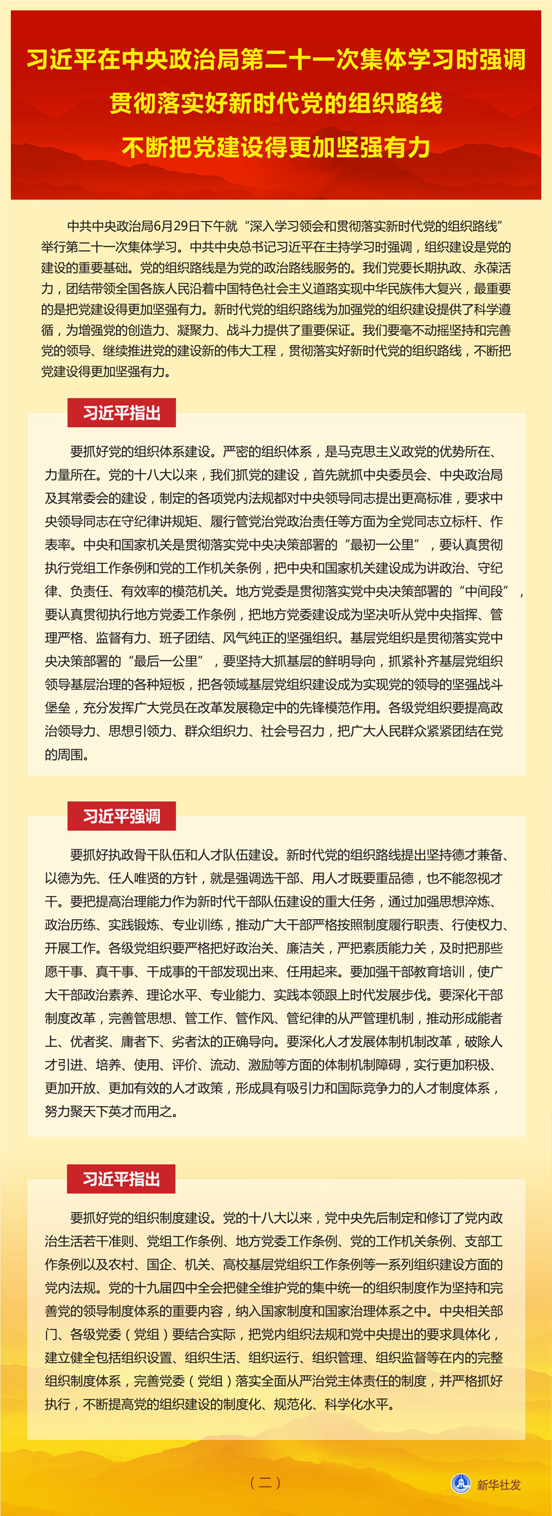 新華社北京6月30日電 中共中央政治局6月29日下午就“深入學(xué)習(xí)領(lǐng)會(huì)和貫徹落實(shí)新時(shí)代黨的組織路線”舉行第二十一次集體學(xué)習(xí)。中共中央總書(shū)記習(xí)近平在主持學(xué)習(xí)時(shí)強(qiáng)調(diào),組織建設(shè)是黨的建設(shè)的重要基礎(chǔ)。黨的組織路線是為黨的政治路線服務(wù)的。我們黨要長(zhǎng)期執(zhí)政、永葆活力,團(tuán)結(jié)帶領(lǐng)全國(guó)各族人民沿著中國(guó)特色社會(huì)主義道路實(shí)現(xiàn)中華民族偉大復(fù)興,最重要的是把黨建設(shè)得更加堅(jiān)強(qiáng)有力。新時(shí)代黨的組織路線為加強(qiáng)黨的組織建設(shè)提供了科學(xué)遵循,為增強(qiáng)黨的創(chuàng)造力、凝聚力、戰(zhàn)斗力提供了重要保證。我們要毫不動(dòng)搖堅(jiān)持和完善黨的領(lǐng)導(dǎo)、繼續(xù)推進(jìn)黨的建設(shè)新的偉大工程,貫徹落實(shí)好新時(shí)代黨的組織路線,不斷把黨建設(shè)得更加堅(jiān)強(qiáng)有力。