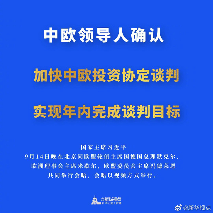 國(guó)家主席習(xí)近平14日晚在北京同歐盟輪值主席國(guó)德國(guó)總理默克爾、歐洲理事會(huì)主席米歇爾、歐盟委員會(huì)主席馮德萊恩共同舉行會(huì)晤,會(huì)晤以視頻方式舉行。