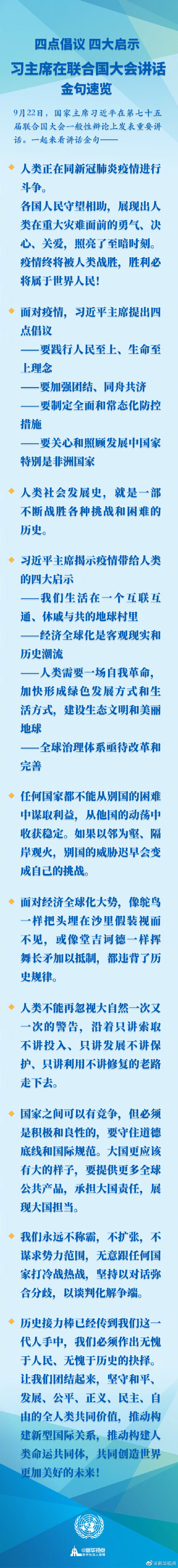 四點倡議 四大啟示 習主席在聯合國大會講話金句速覽