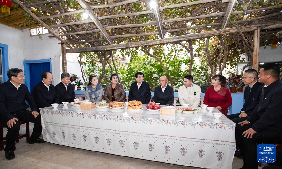 10月21日至24日,中共中央政治局常委、全国政协主席王沪宁在新疆和田、喀什调研。这是23日下午,王沪宁在疏勒县塔孜洪乡台吐尔村同干部群众交流。新华社记者 李涛 摄