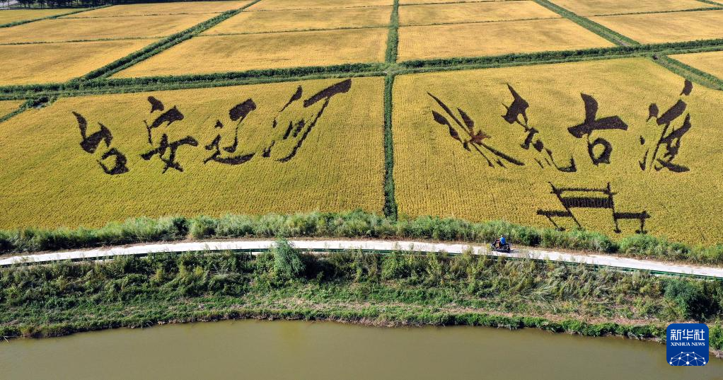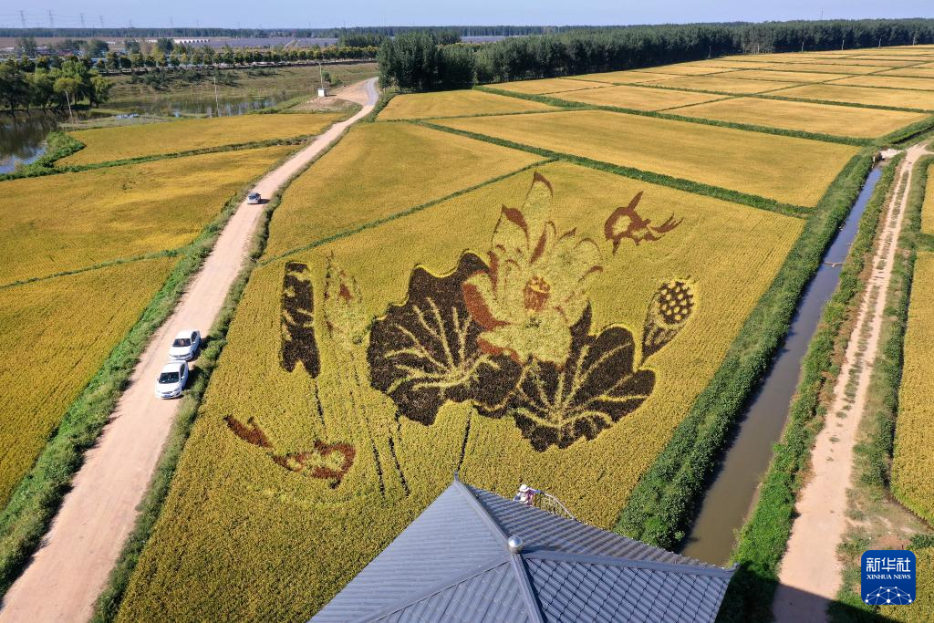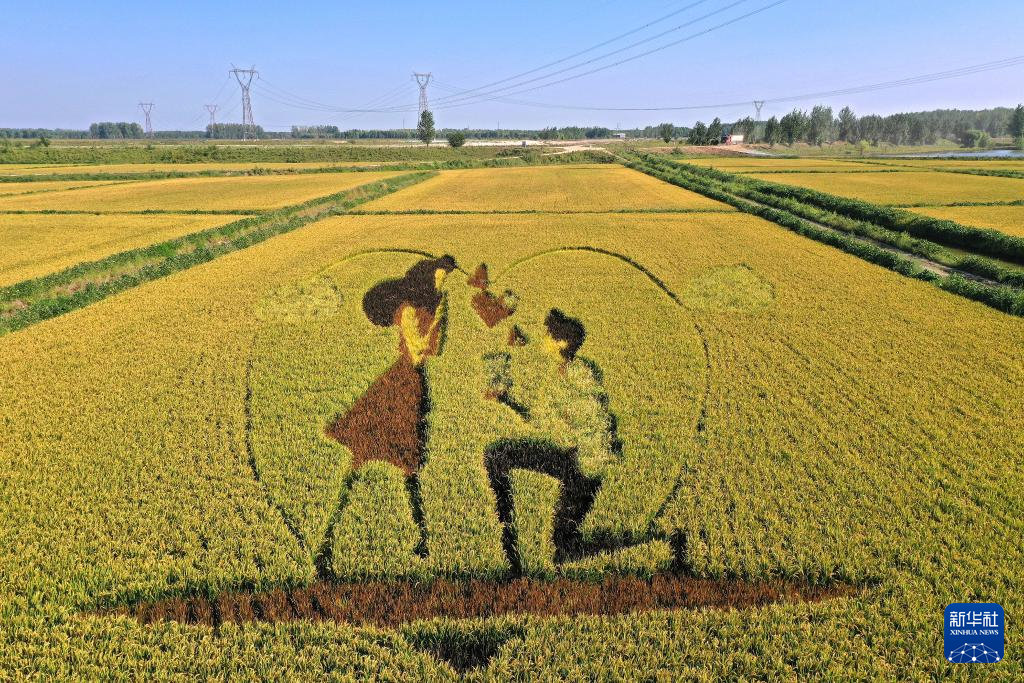 初秋时节,辽宁省鞍山市台安县辽河文化旅游景区的稻田画吸引不少游客前来参观游览。由多种颜色组成的巨型稻田画勾勒出丰收壮美景象。