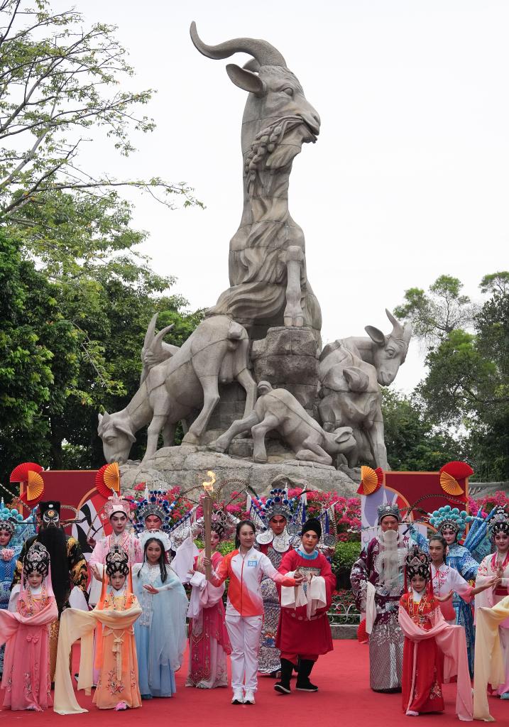 11月2日,火炬手李嘉宜(中)在广州越秀公园内的五羊雕像前传递火炬。当日,中华人民共和国第十五届运动会火炬传递广州站举行。新华社记者 杜宇 摄