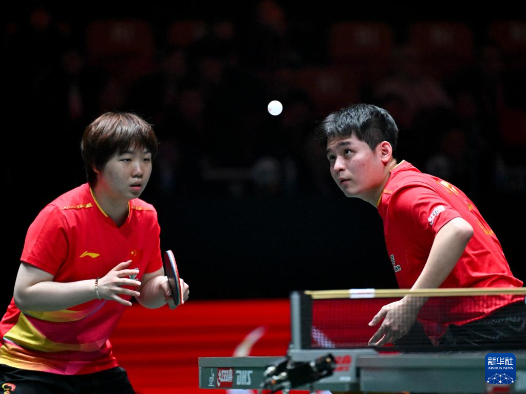 12月1日,中国队组合蒯曼/林诗栋(右)在混双比赛中。他们3比0战胜埃及队组合巴德尔·穆斯塔法/玛尔娃·阿尔霍达比。