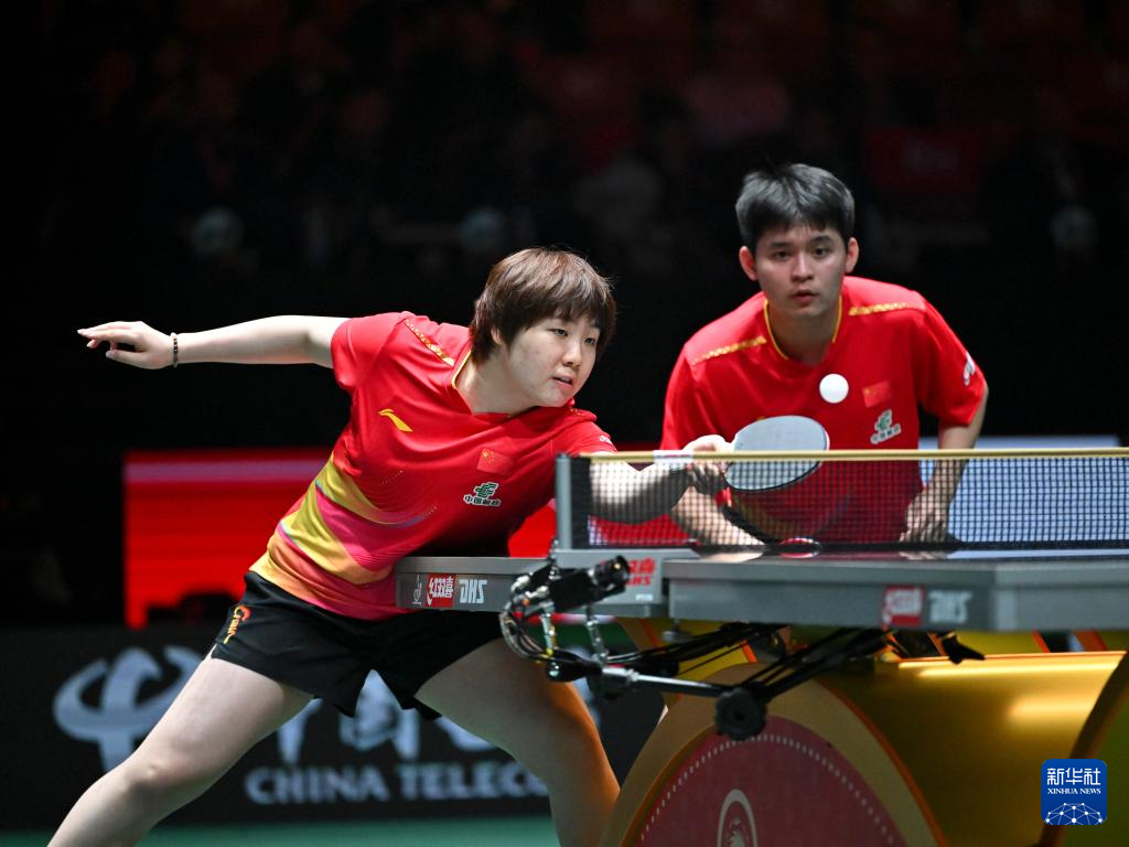 12月1日,中国队组合蒯曼(左)/林诗栋在混双比赛中。他们3比0战胜埃及队组合巴德尔·穆斯塔法/玛尔娃·阿尔霍达比。
