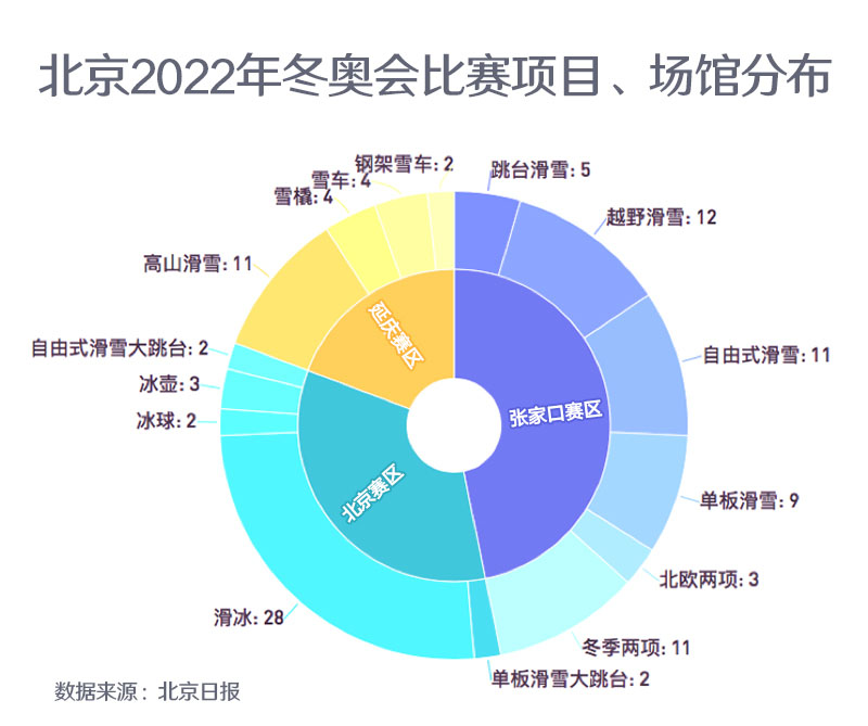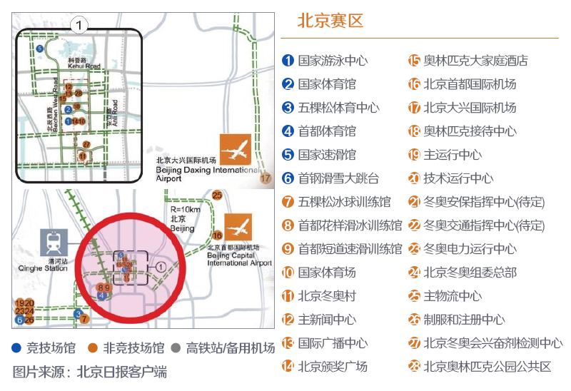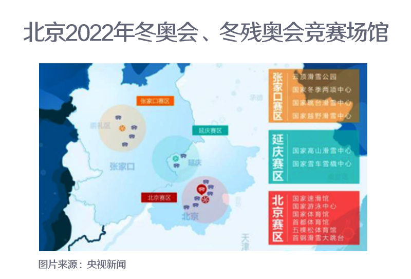 北京冬奧會設有北京、延慶和張家口三個賽區,共計劃使用25個場館,其中直接用于賽事的競賽場館12個。