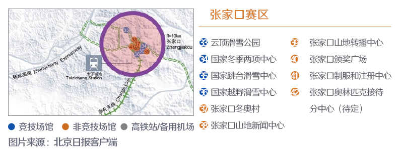 ??? 張家口賽區位于河北省張家口市崇禮區,共有7個競賽和非競賽場館,其中4個為新建場館、1個為現有場館、2個為臨時場館。