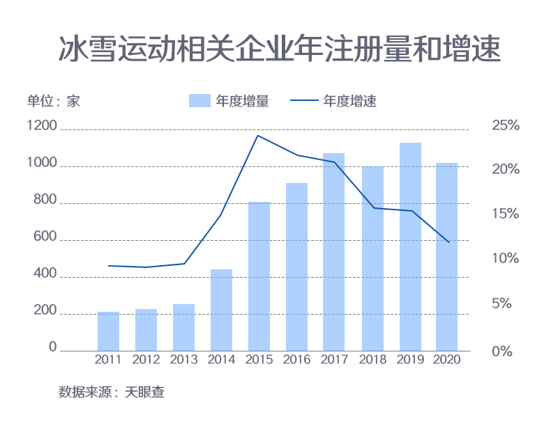 ??? 資料顯示,2015年7月31日,北京獲得2022年冬奧會舉辦權。同年,天眼查專業版數據顯示,冰雪運動相關企業年度注冊增速達到了歷史峰值(全部企業狀態),為24.4%。此后的幾年,冰雪運動相關企業總量仍呈上漲態勢。以工商登記為準,2020年我國共新增超過1,000家冰雪運動相關企業。