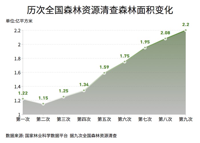 ??? 根據國家林業和草原局統計,目前全國森林面積達到2.2億公頃,森林覆蓋率23.04%?;赝糯稳珖仲Y源清查結果可以看出,我國的森林覆蓋率逐年穩步提高。還有一些監測數據顯示,近20年來中國新增植被覆蓋面積約占全球新增總量的25%,居全球首位。