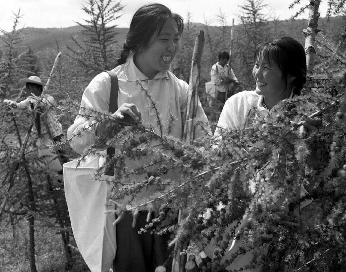 ??? 河北省圍場縣塞罕壩機械林場職工積極采摘松樹種,解決人工造林需要。新華社記者趙連升攝 1978年10月30日發