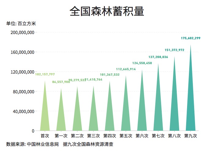 ??? 森林蓄積量是反映一個國家或地區森林資源總規模和水平的基本指標之一,也是反映森林資源的豐富程度、衡量森林生態環境優劣的重要依據?!笆濉逼陂g,我國森林蓄積量超過175.6億立方米,森林植被碳儲量91.86億噸。