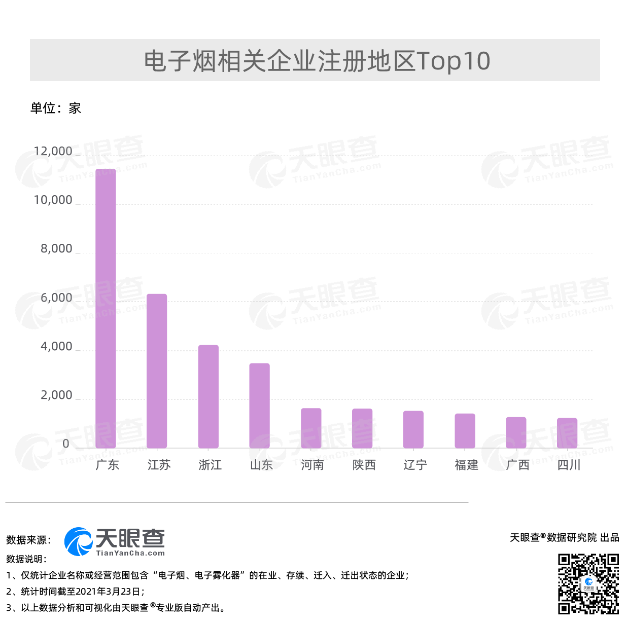 ????? 電子煙行業(yè)已經(jīng)在全球范圍內(nèi)顯露不可小覷的發(fā)展趨勢(shì),在中國(guó)也總體呈現(xiàn)上升趨勢(shì)。天眼查專業(yè)版數(shù)據(jù)顯示,目前我國(guó)共有超4.7萬(wàn)家企業(yè)名稱或經(jīng)營(yíng)范圍含“電子煙、電子霧化器”。從地域分布上看,廣東的電子煙相關(guān)企業(yè)數(shù)量最多,超1.1萬(wàn)家。據(jù)界面新聞此前報(bào)道,全球90%的電子煙都出自深圳寶安區(qū),這里已經(jīng)成為全球最大的電子煙生產(chǎn)基地,被稱為“全球霧谷”。