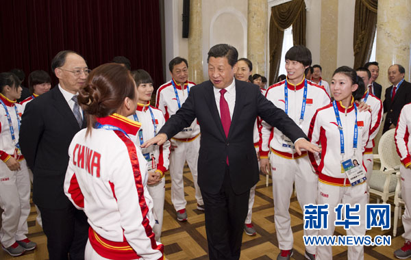 ??? 2月7日,中共中央總書記、國家主席、中央軍委主席習(xí)近平在俄羅斯索契親切看望參加第二十二屆冬季奧林匹克運(yùn)動(dòng)會(huì)的中國體育代表團(tuán)。這是習(xí)近平同運(yùn)動(dòng)員親切交流。新華社記者 黃敬文 攝